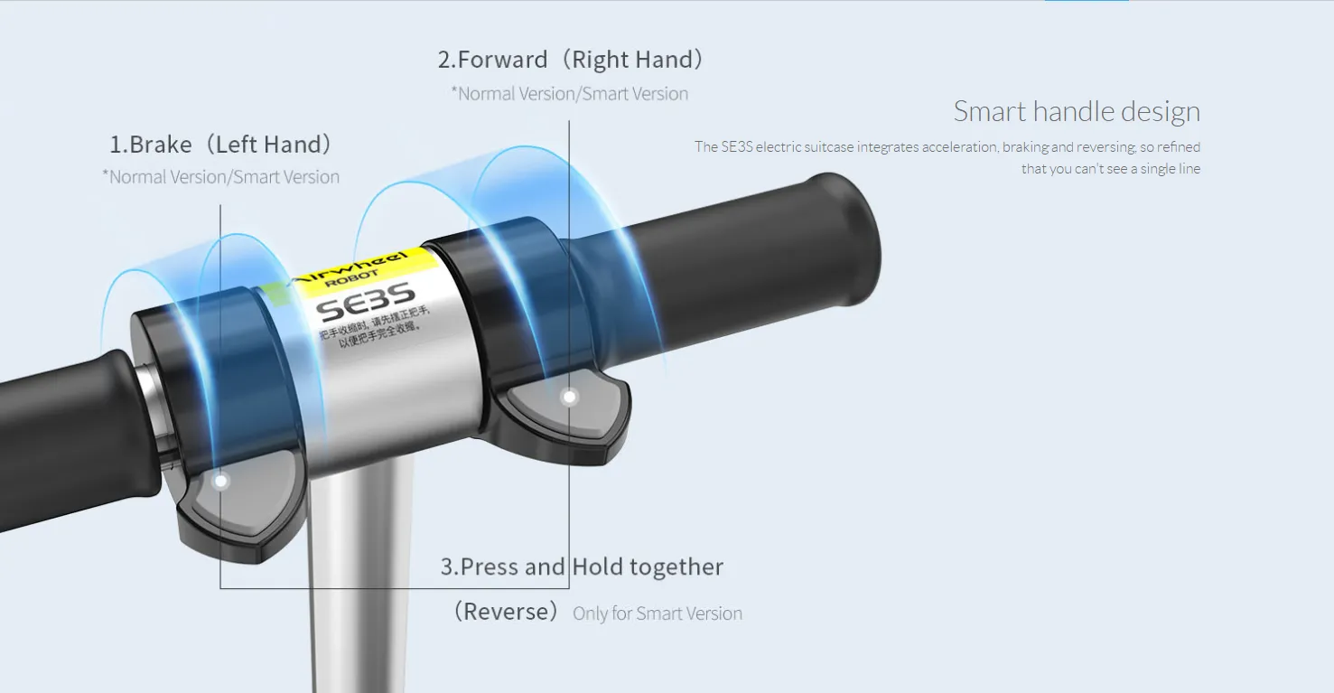 Smart handle has 2 buttons. Press and hold the left button to brake, press and hold the right button to move forward, and press the left and right buttons simultaneously to move backward.