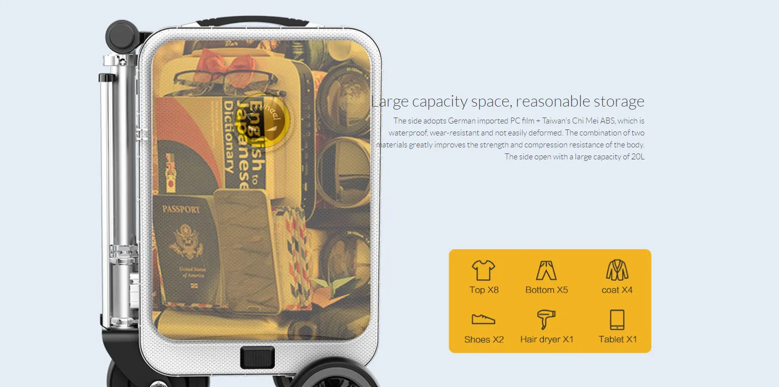 luggage is mainly made of high-quality aluminum alloy material, which allows the smart luggage to bear a maximum load of 110KG. Most of people can ride on it. In addition, due to the material of scooter luggage is thin, the capacity of the luggage is up to 20L. The capacity can meet your short-distance trip.